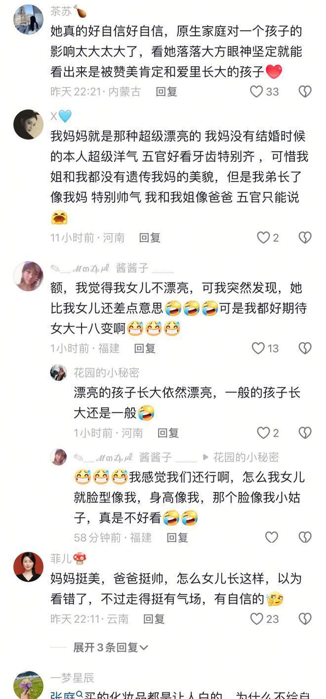 还有一些客观评论:“我就是,爸妈都长的不错,但是我取了缺点长的,虽然是普通人,没那么多人关注,但是也从小被说到大,亲戚邻居同学都说我长得丑。何况她爸妈是公众人物,所以我太知道她的心情了,真心觉得不要去抨击一个女孩的长相,她的内心伤痛会伴随她一生。”